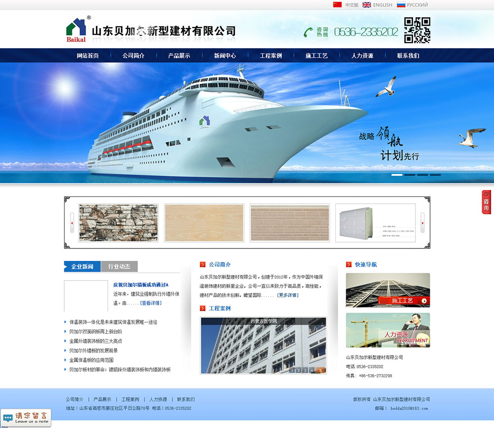 山東貝加爾新型建材有限公司,創(chuàng)建于2012年,是中國外墻保溫裝飾行業(yè)的新星企業(yè)。公司前身俄羅斯海達公司成立于2006年,主要生產(chǎn)彩鋼瓦,是中國最早入駐俄羅斯的生產(chǎn)型企業(yè)。一直以來,我們始終致力于高品質(zhì)、高性能建材產(chǎn)品的技術(shù)創(chuàng)新,注重采用國際先進裝備為廣大客戶生產(chǎn)優(yōu)質(zhì)的產(chǎn)品。我們一直關(guān)注國內(nèi)裝飾保溫一體板的技術(shù)導(dǎo)向及市場需求,經(jīng)過多年的技術(shù)研發(fā)和對國內(nèi)外尖端設(shè)備的考察考核,“貝加爾墻板”已經(jīng)成功面世。“貝加爾墻板”業(yè)已通過了國家質(zhì)檢部門的質(zhì)量檢驗,政府準發(fā)了全國節(jié)能產(chǎn)品推廣證書,并獲得了多項由國家專利局頒發(fā)的實用新型專利證書,擁有歐洲CE認證和俄羅斯質(zhì)量防火認證。短短的時間內(nèi),該產(chǎn)品大量出口俄羅斯、中亞、韓國、蒙古、伊拉克、維多利亞等地區(qū),在國內(nèi)已經(jīng)擁有多處樣板工程。